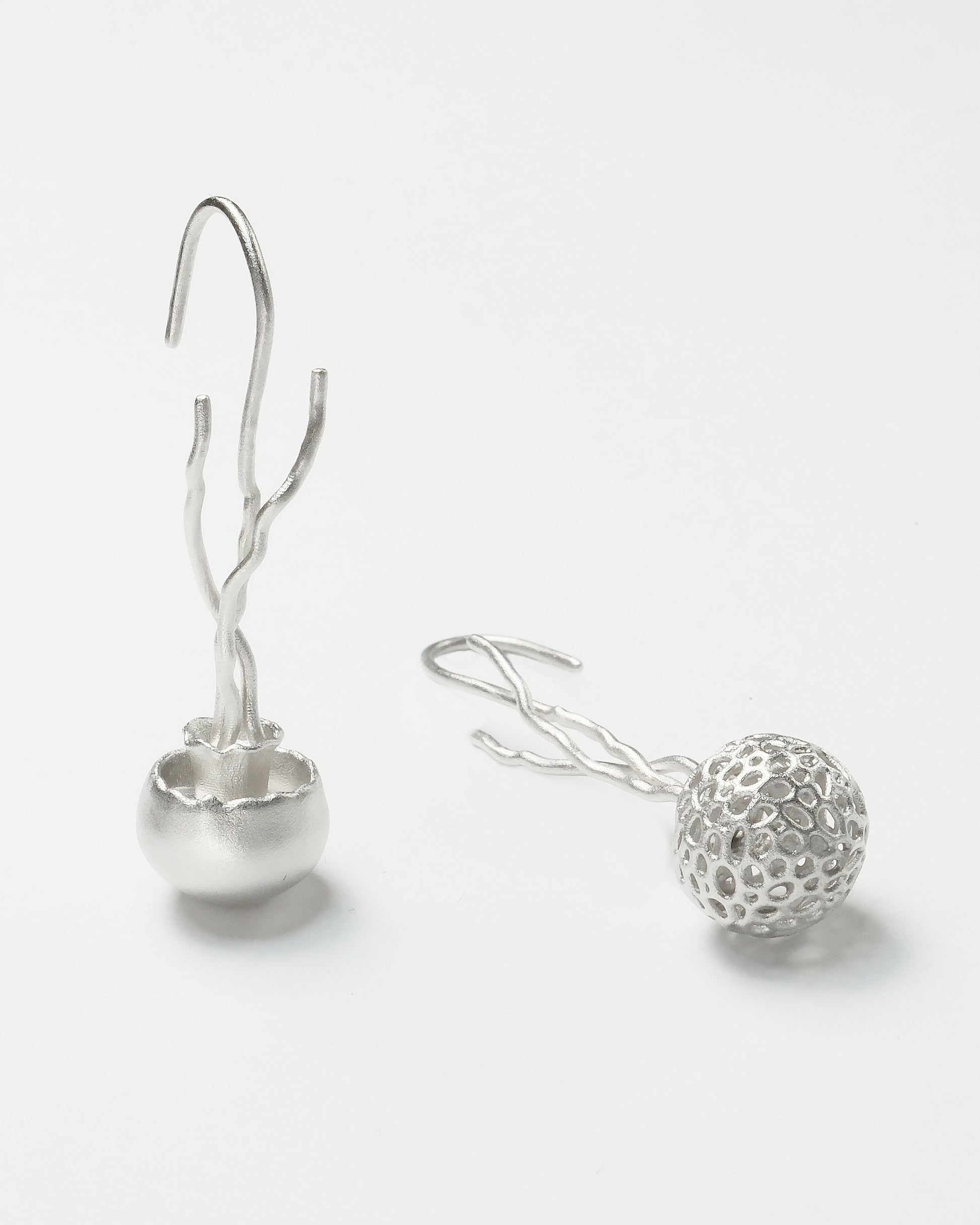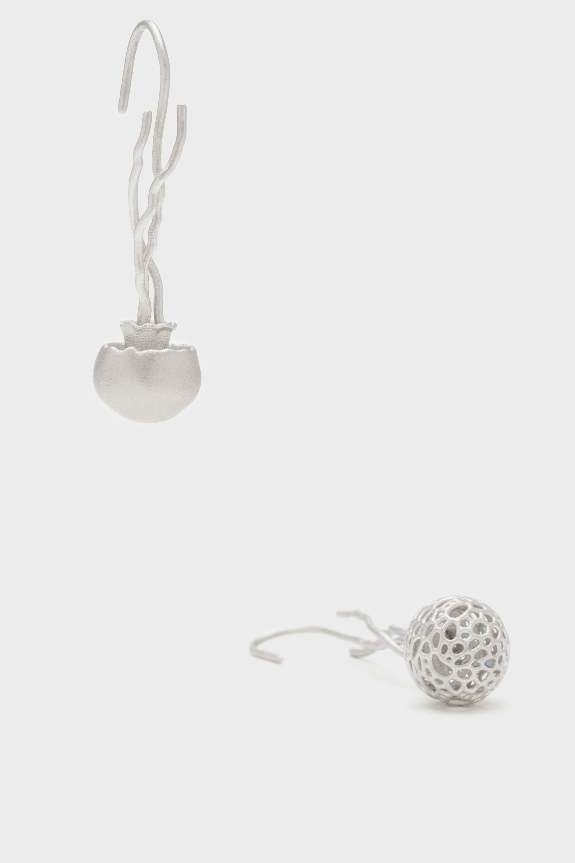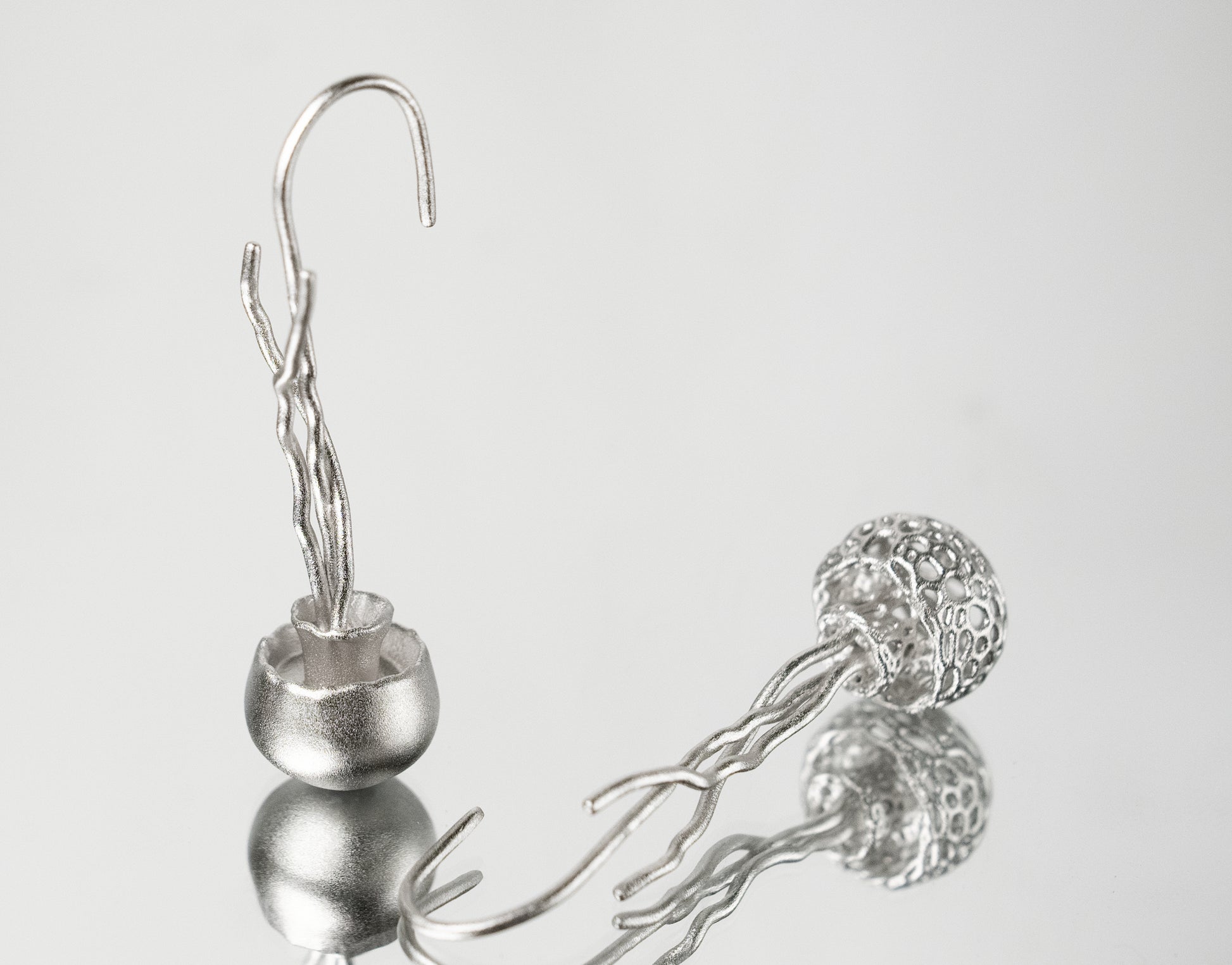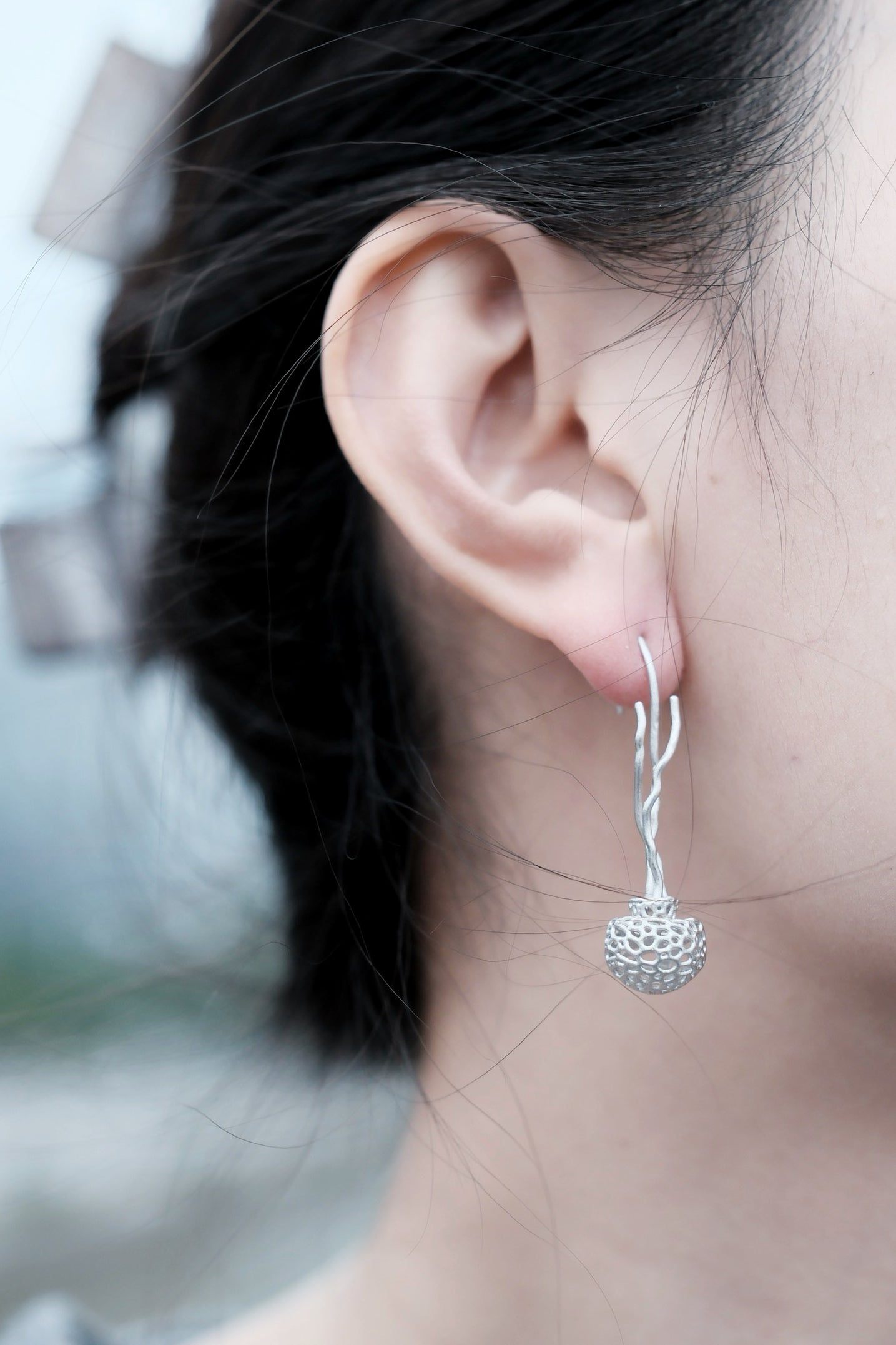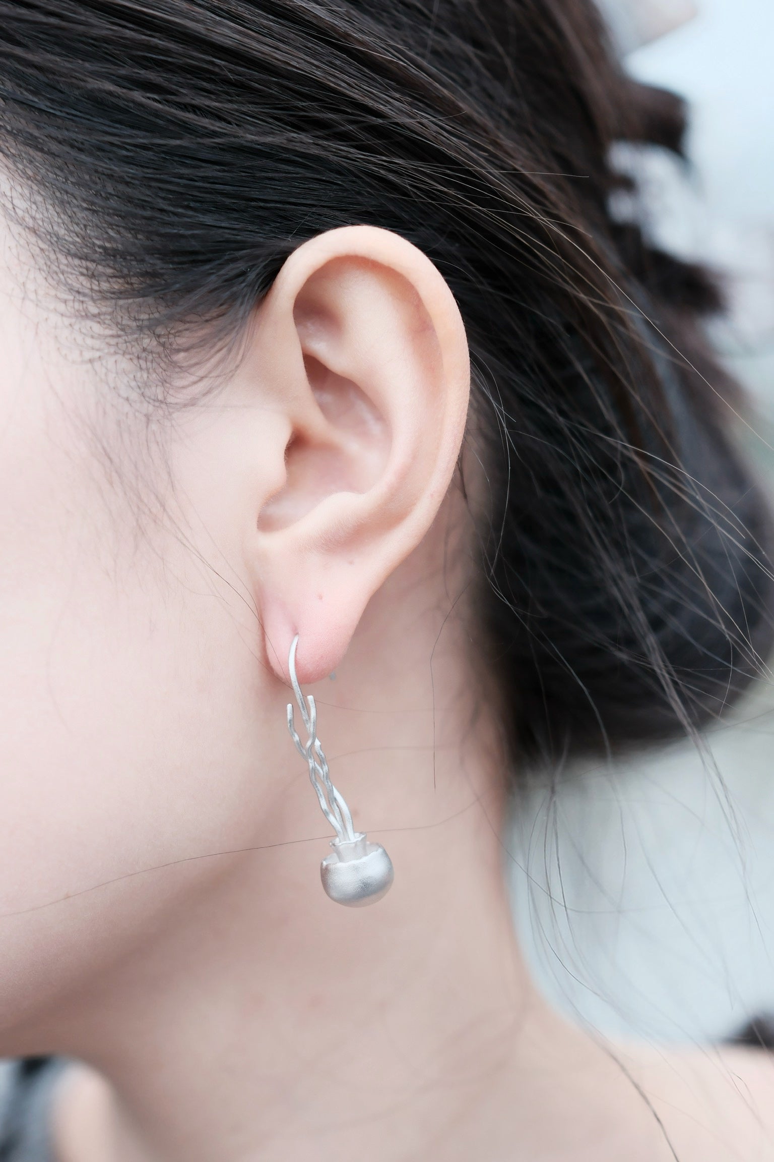 These pendant earrings are inspired by the mysterious creature of the ocean—the jellyfish. Renowned for their unique shapes and graceful movements, jellyfish symbolize the softness and freedom of the sea. The streamlined design of the earrings captures the lightness of a jellyfish, showcasing a sense of fluidity and natural beauty, as if gently swaying by your ear, bringing a touch of the ocean with you.